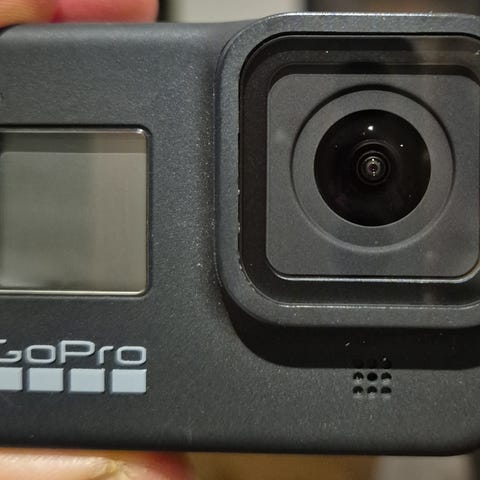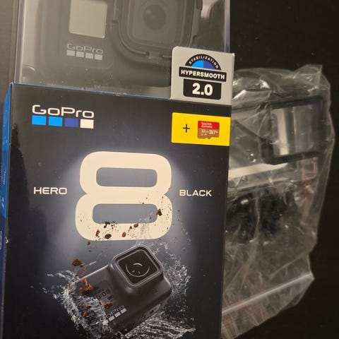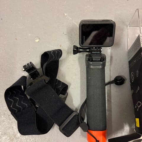 GoPro actionkamera med inkludert tilbehør som lader, kabel og beskyttende oppbevaringsveske. Kameraet har et kompakt design og er egnet for ulike utendørs- og sportsaktiviteter.