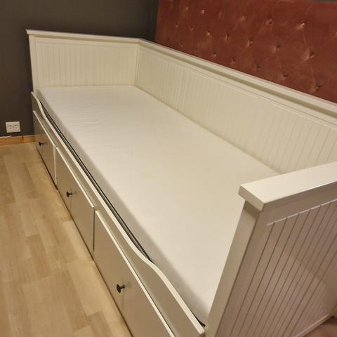 13-åringen i huset må oppgradere til større seng. Sengen har noen bruksmerker/slitasje på rammen (se bilde), men ellers helt fin. Genial med god lagring (av f.eks brettspill - se bilde) og med mulighet til å slå den ut om man får besøk (bilde).