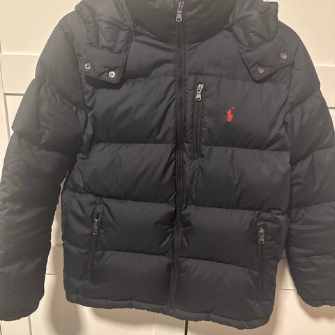 Ralph Lauren dunjakke i blå ,junior str L tilsvarer S. Jakken er laget med dun som materiale, egnet for kjøligere vær. Den har hette og glidelåslukking foran.