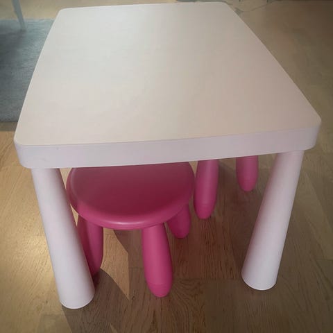 IKEA barnemøbel sett som inkluderer et bord og to stoler. Noe bruksmerker på ene stolen. Se bilde.
