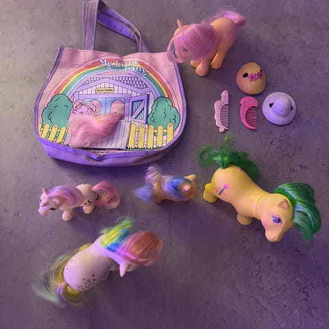 My Little Pony blå hest leketøy med rosa man og hale, dekorert med jordbær og blomster på siden. Laget av plastmateriale.