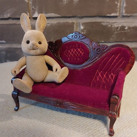 Sett med miniatyrmøbler i tre til dukkehus, inkludert skap, skuffer og seng. Møblene har ulike farger og design, egnet for bruk i dukkehus eller som samleobjekter.