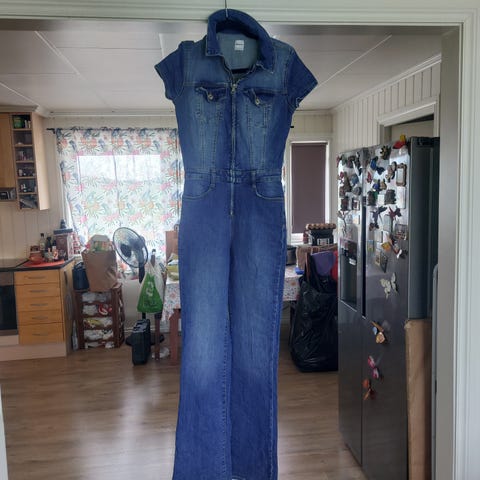 Bershka Denim Jumpsuit i blå farge, størrelse M for kvinner. Laget av denim materiale. Kortermet design med lommer foran og bak, glidelås foran og krage.