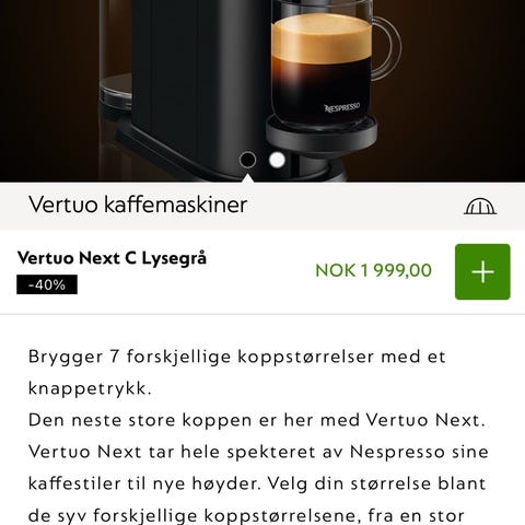 Vertuo pluss kapselmaskin fra Nespresso. Kompakt design med enkel betjening for brygging av espresso og lungo. Passer til bruk i hjemmet eller kontoret 😃 Kom gjerne med bud!