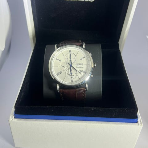 Seiko herreklokke med oransje urskive og svart bezel. Klokken har en rustfri stållenke og tydelige markører på urskiven. Designet for herrebruk.