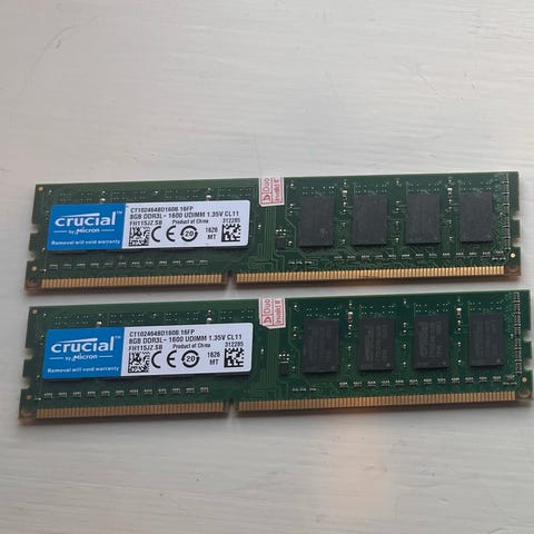 Crucial 32GB KIT bestående av 2 moduler på 16GB stk. Aldri brukt.