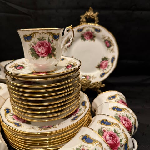 Alt er hele og oene bortsett fra en kakefat som er skår på kanten.