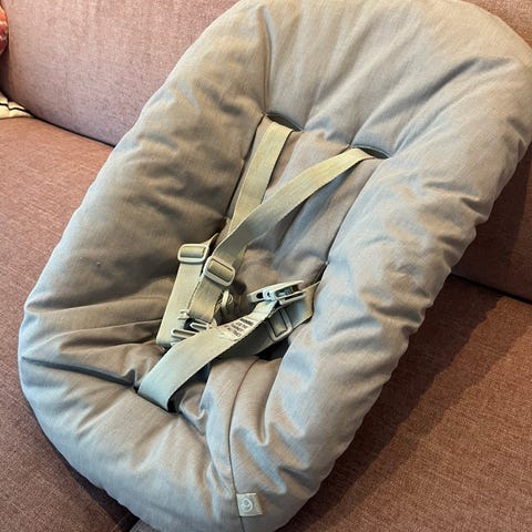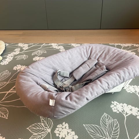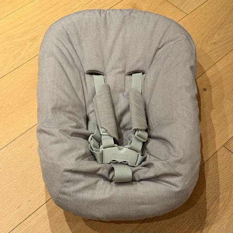 Stokke Newborn seat til Tripp Trapp Stol med polstret sete og sikkerhetssele. Designet for barn, egnet for bruk ved spisebord eller andre aktiviteter som krever barnestol. Setet er laget med mykt materiale for komfort og har justerbare stropper for sikkerhet. Veldig koselig å kunna ha babyen ved bordet, og veldig koselig for babyen å komme seg opp fra gulvet litt.