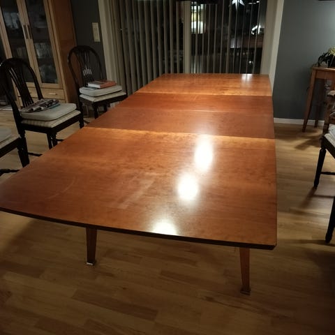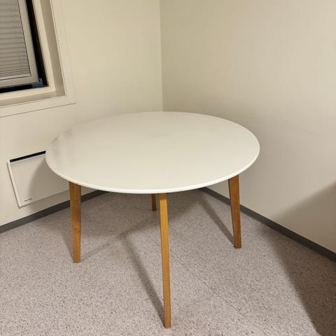 Stilrent og solid spisebord. Godt brukt, med masse bruksmerker (se bilder). Laminert og trenger litt oppfriskning. Demontert og klart til henting. Pris kan diskuteres