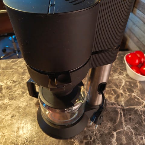 Jeg selger en Bonamat TH. Enheten har en eller flere dårlige komponenter på kretskorter og må fikses eller bytte kretskort for å kunne brukes. Kan evnt. brukes som deler. Den slår seg på og får strøm men ingenting skjer når man trykker på knappen. Utenom dette er den i god stand. Den kommer med filterholder, ikke noe annet er inkludert.