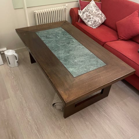 Sofabord i heltre eik, med hylle under og en liten skuff. Har noen små merker her og der. Kan pusses ned og oljes om man ønsker det.