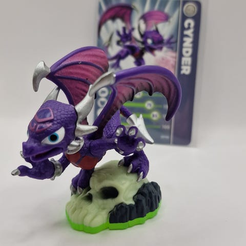 Skylanders Cynder figurine i lilla med detaljer i sølv og rødt. Figuren har vinger og står på en base med skjelettmotiv. Orginalt kort med kortbeskytter medfølger.