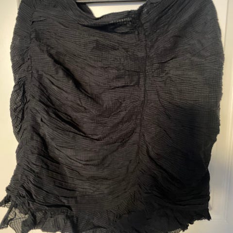 Jeg kjøpte det selv brukt. Det er visst kjøpt på et lagerutsalg til Pia Tjelta, men Ingen lapper inni skjørtet. Selges derfor billig. For lite til meg som bruker en S/liten M - vil si at det passer xs.