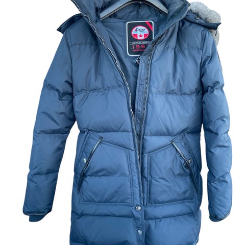 Pen kåpe med avtagbar hette . Str44. Tror det er dun , fant ikke noe lapp . Lengden er 90 cm