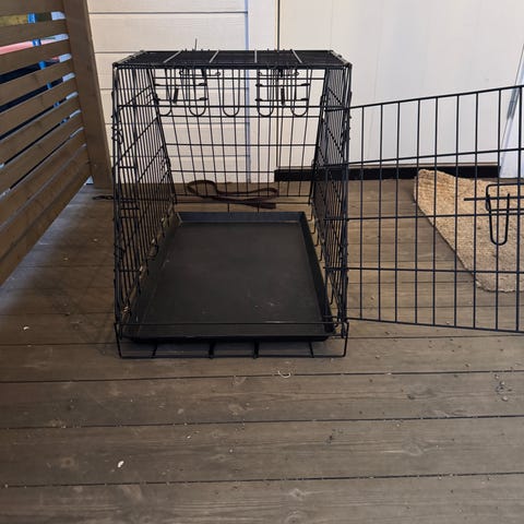 Selger buret jeg har brukt til en liten dsg hann. Solid og lettvint. Følger m vegg som kan justeres ift valpevekst, så kan ha det lenge.