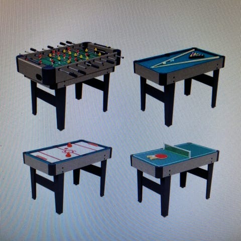 12 in 1 Multi-spill Bordspill med flere spillfunksjoner inkludert luft hockey, bordtennis, biljard og bordfotball. Spillbordet har konstruksjon med ben og tilhørende utstyr for de ulike spillene. Passer for innendørs bruk.