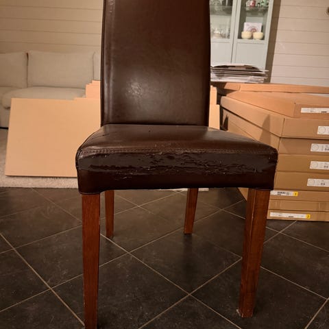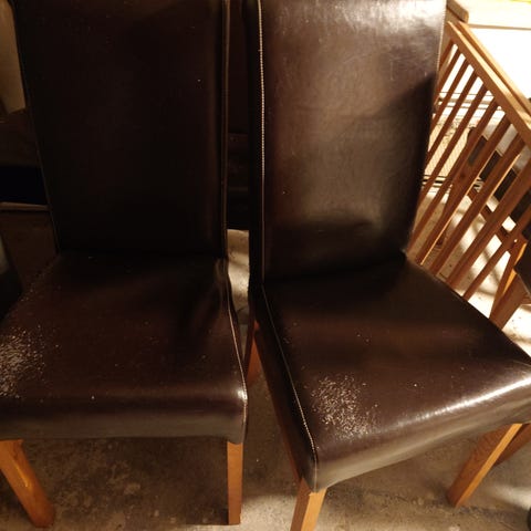 Spisestoler i skinn. Alle er funksjonelle, et par er nokså slitt i skinnet, mens andre er helt fine.