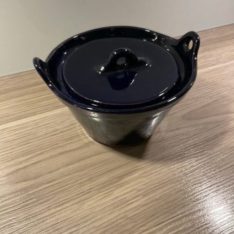 Flott smørsmelter med tykk bunn. Tipper det er stål innvendig. Den er 10 cm i dia og høyden er 6,5 cm.