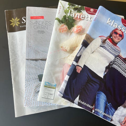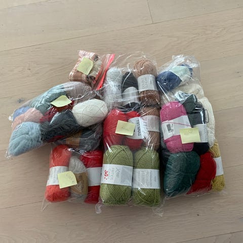 Garnpakke bestående av ulike garnmerker med et bredt spekter av farger. Noen er brukt av og noen ubrukt, totalt 23 nøster. Pris kr 350,-