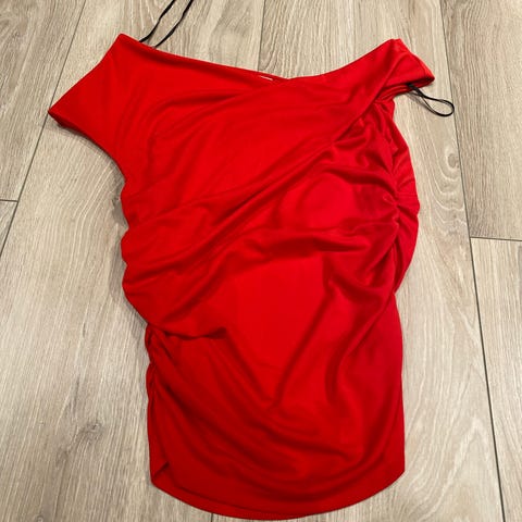 Selger denne røde toppen med glidelås foran i str. S. Helt ny, aldri brukt. 175kr.