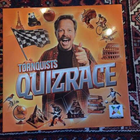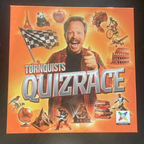 Tørnquists Quizrace brettspill med brett, kort, spillebrikker og regler. Spillet er designet for 2-8 spillere, anbefalt alder 12 år og oppover. Inneholder spørsmålskort og ulike spilleelementer.