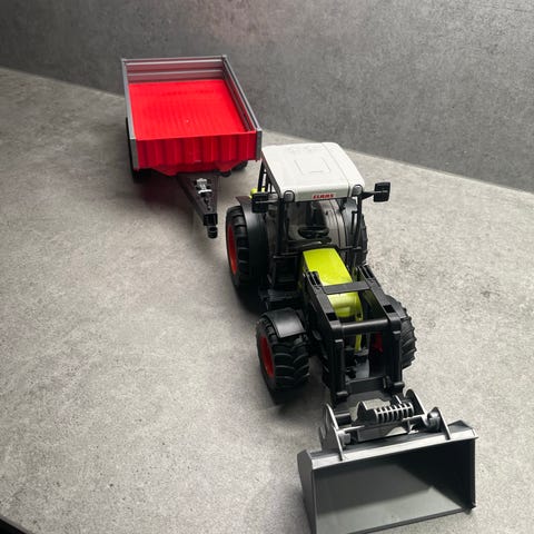 Bruder John Deere traktor leketøysmodell i grønn farge. Modellen har detaljer som førerhus og store dekk, egnet for barn som leketøy.