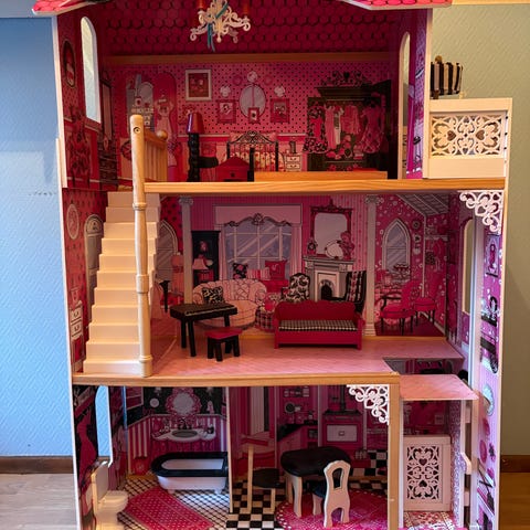 KidKraft dukkehus laget i tre med flere rom og detaljerte møbler. Dukkehuset har et fargerikt interiør med møbler inkludert stue, kjøkken, bad og soverom. Passer for barn og gir mulighet for kreativ lek.