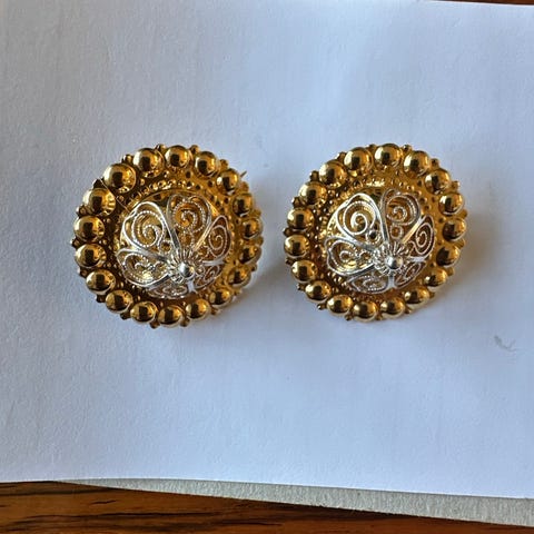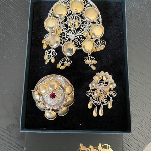 Borer, 40 mm, gullforgylt med hvite kruser, rød stein. UbruktNordhordland