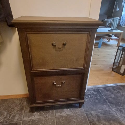 Skoskap i det som virker som heltre eik selges.