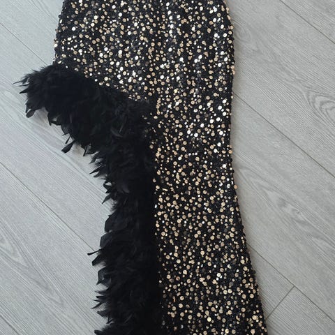 Festkjole med fjær og blonder. Kjøpte denne hos en designer i Oslo for 14 år siden som jeg ikke husker navnet på. Passer nok best en str m-l