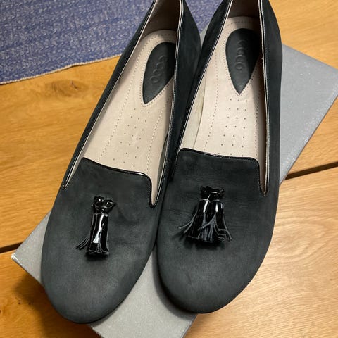 ECCO Hæler i størrelse 39 laget av svart skinn. Skoene har en rund tå og en tykk hæl, egnet for formelle og hverdagslige anledninger.