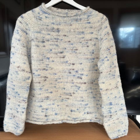 Helt ubrukt og nystrikket Sola Sweater (med hette og lomme) fra Le Knit selges rimelig pga plassmangel. Farge: Beige (dobbel tråd). Strikket i det eksklusive garnet Rauma Puno Petit og Sandnes Tynn Silk Mohair, og er helt nydelig på, myk og god, og svært luftig og lett (veldig elastisk). Passer både S og M. Garnpris er rundt 1800 kr.
