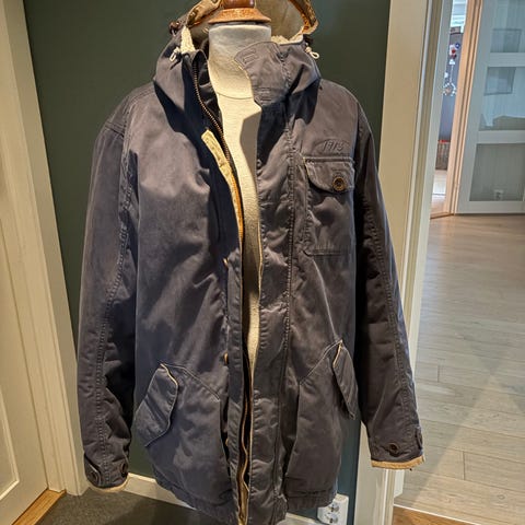 Jean Paul Vinterjakke i størrelse M, grønn farge, laget av polyester. Jakken er designet for menn og egner seg til utendørs bruk i kalde værforhold. Jakken har fått gul maling på det ene ermet