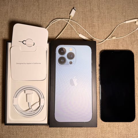 Apple iPhone 13 Pro mobiltelefon med 128 GB lagringskapasitet. Enheten har en farge i grafitt og er utstyrt med flere kameraer på baksiden. Sideknapper er tilgjengelige for volumkontroll og stillemodus. Inkluderer et beskyttelsesdeksel i tillegg.