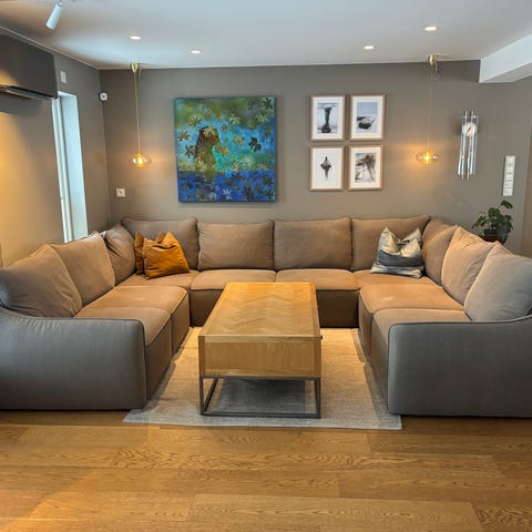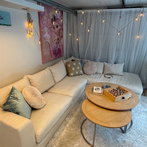 Sofaen kommer i 2 deler og kan henges sammen. Den er imidlertid defekt og jeg har kun satt de inntil hverandre uten problem. Kan sikkert få kjøpt et tilsvarende system på møbelbutikk.