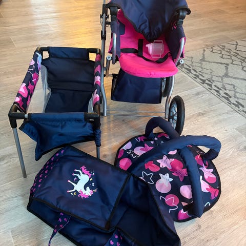 Pent brukt blå og rosa dokkevogn får barn