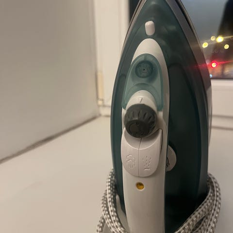 dampstrykejern i hvit og svart farge. Utstyrt med en vannbeholder for dampfunksjon og et ledningsfritt design for enkel bruk. Egnet for effektiv stryking av klær.