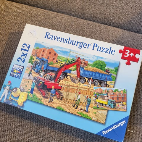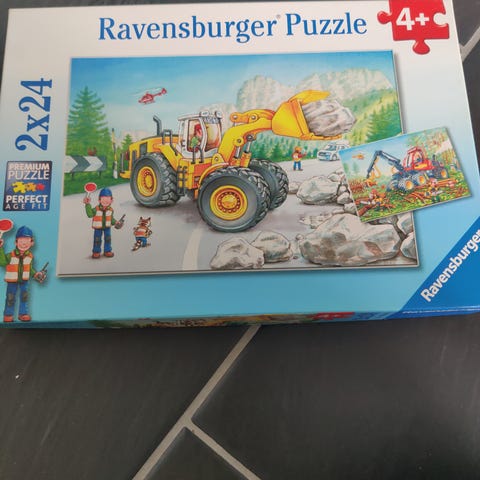 Schmidt Puzzles 3x24 puslespill med motiv av anleggsmaskiner. Puslespillene har 24 brikker hver og passer for barn fra 3 år og oppover. Motivet viser ulike anleggsmaskiner i arbeid, inkludert gravemaskin, betongbil og kran.