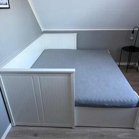 Pent brukt seng. 3 store skuffer til oppbevaring. Kan dras ut til dobbeltseng. Er demontert.