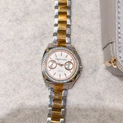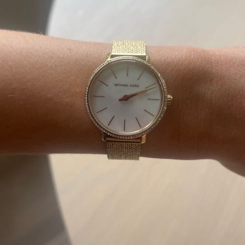 GUESS Dame klokke med lenkearmbånd i metall. Klokken har en urskive med krystall-lignende detaljer og krystaller hele veien på utsiden.