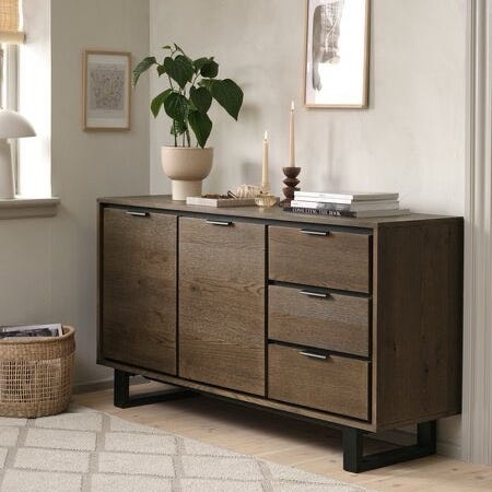 Nola skjenk 140x45 H76 2 sjalusidører 2 hyller hvitoljet eikefiner med metallben svart.