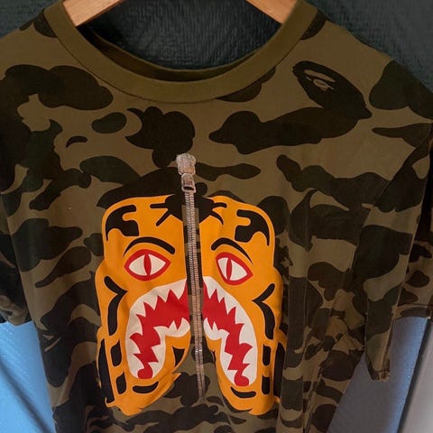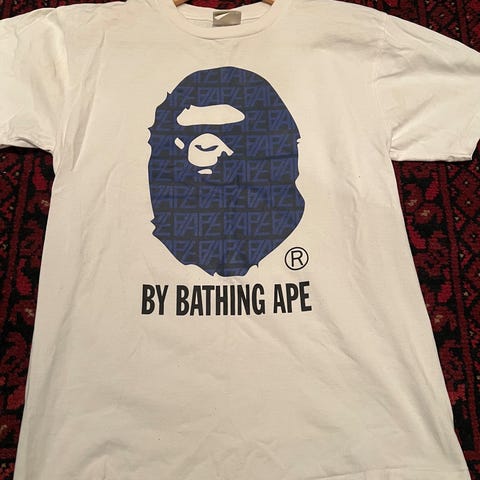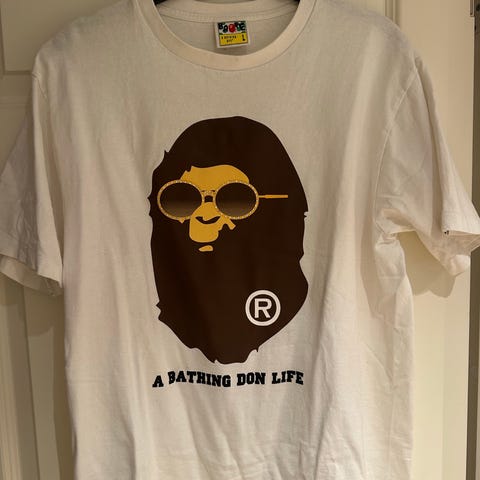 Selger en tøff og moderne hvit t-skjorte i BAPE-inspirert design, størrelse Large.
