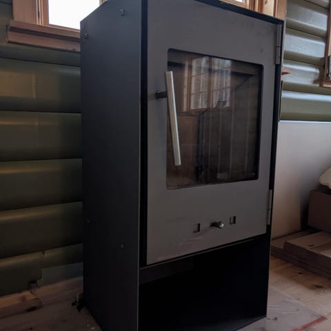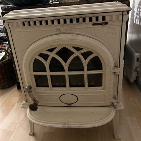 Jøtul 313 vedovn med støpejernskonstruksjon og dekorativt mønster. Ovnen har svart front med dører for vedinnsetting og asketømming, samt sider i en rødlig farge med strukturert overflate. Kombinert olje og vedfyr. Stått i nytt hus og har derfor ikke kjennskap til tilstand eller om alt fungerer som det skal