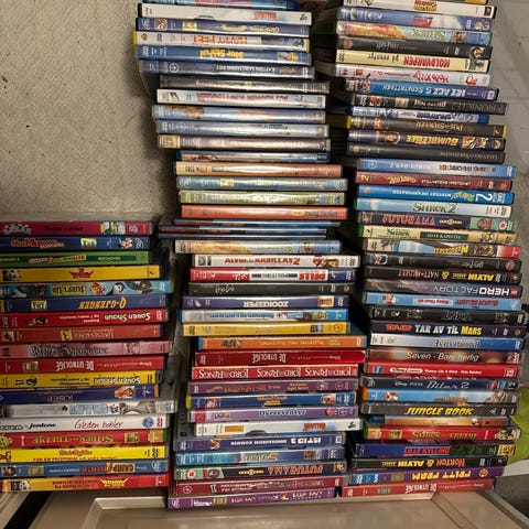 Samling av DVD-filmer og TV-serier i ulike sjangre. Inkluderer titler som "Jungelboken", "Aladdin", "Lucky Luke", "The Wild Wild West" og "Historien om P1". Varierende antall plater og coverdesign. Mye til barn. Kom og plukk for 25 per stk.