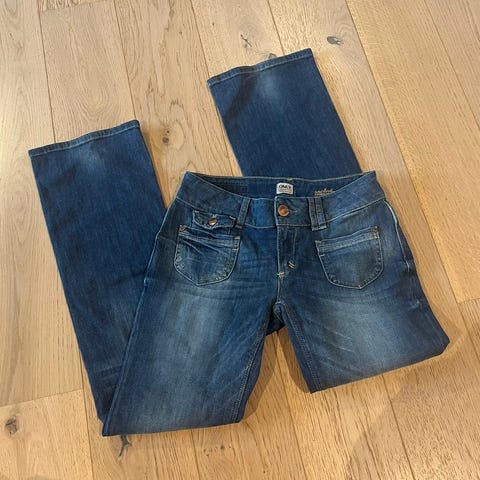 Wrangler Flare jeans for dame i størrelse S med midjevidde W28. Laget av blå denim. Jeansene har en utsvingt fasong og klassiske lommer foran og bak. Ingen bruksmerker.
