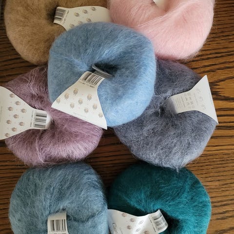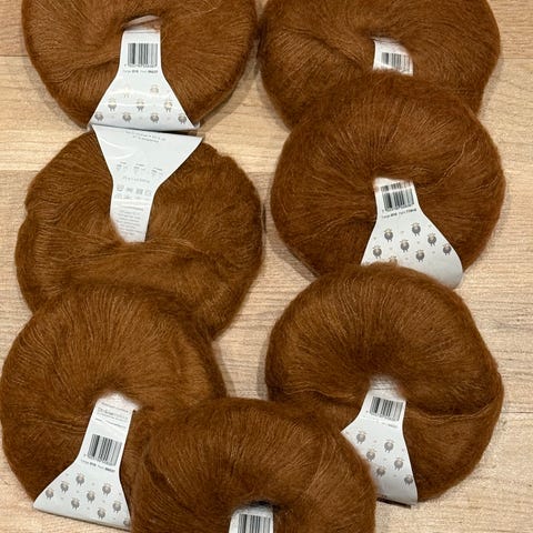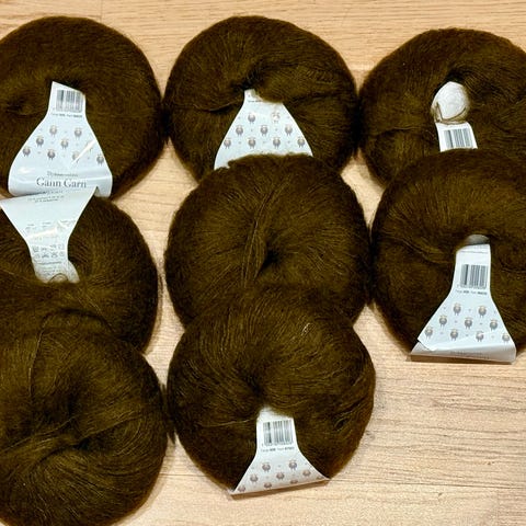 Gann Garn kid mohair, 53% mohair 20% ull 27% polyamid.