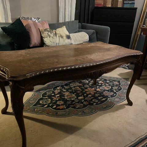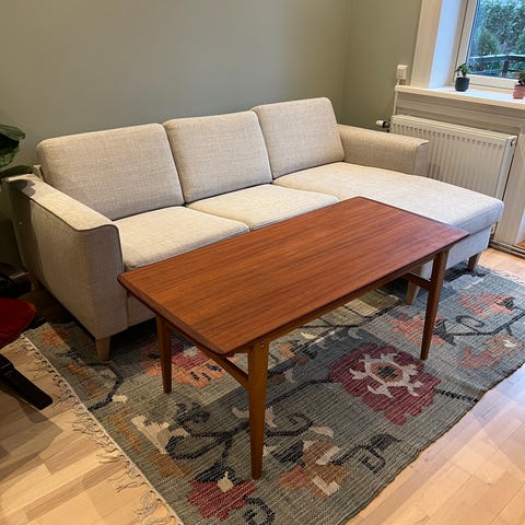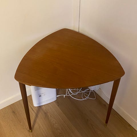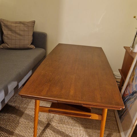 Utrolig praktisk salongbord søker ny eier. Et teakbord som dessverre ble mahognibeiset av en slektning en gang i tiden, og som kan få nytt liv om det slipes ned. Det er likevel fullt brukbart som det er.