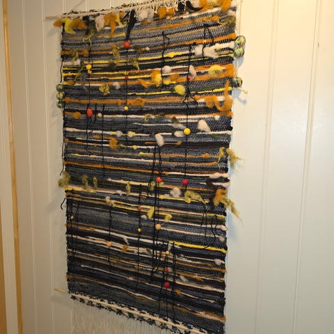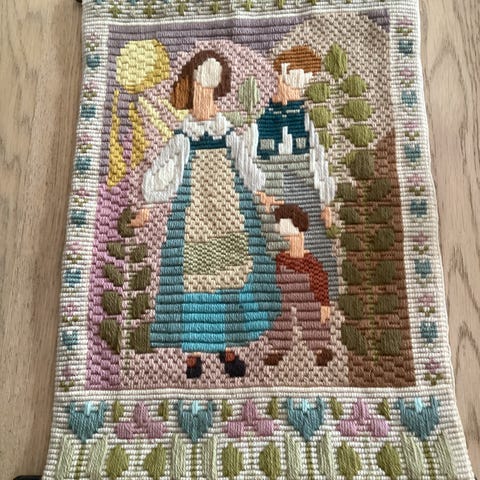 «Blomstereng»,håndvevet veggteppe i delikate,duse farger,en vakker påminnelse midt i vinterkulda om at snart har vi vår,sommer og et hav av blomster rundt oss igjen🥰Teppet er laget av meg på en ordinær barnevev ,lånt av datteren min🥰Selve teppet er vevet med 100% tykt ullgarn. De andre delene er også i ulllgarn: Rosene og bladene er brodert på teppet,mens det ene bladet er laget med makrameteknikk og sydd på teppet. Det samme gjelder «peonene» som jeg har vevet på en blomstervev først og deretter sydd på teppet. Opphengsnoren er i lys,naturfarget skinn,opphengstangen er i ubehandlet treverk. Passer fint på vegg alene eller i en gruppe med andre bilder/posters ol😊 Bildene er tatt ute,i dagslys og det siste er tatt inne i kveldslys.Mål,inkludert stang og frynser er 23x65 cm. Se gjerne de andre annonsene mine med flere håndbroderte tekstiler😊