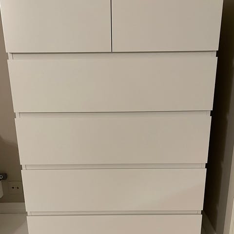 Selger min så vidt 2 år gamle IKEA malm kommode med 6 skuffer. Stått på et klesrom og ser ingen merker eller annet på den. Skuffene glir fint igjen 😊 må hentes i 3 etasje i Lørenskog med heis