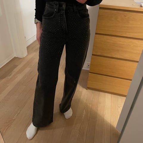 Svart low rise slim fit bukse i str 34/32 som tilsvarer str XS fra merket Only. Litt sleng/flare. Stoff er cotton og elestan. Lengde 95 cm.